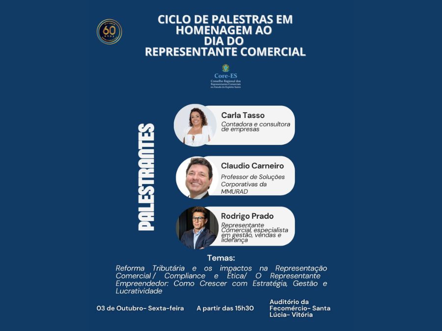 Com o objetivo de valorizar a categoria e incentivar o aperfeiçoamento profissional, o Conselho Regional dos Representantes Comerciais do Espírito Santo (Core-ES) realizará, no dia 03 de outubro, a partir das 15h30, um Ciclo de Palestras em celebração ao Dia Pan-Americano e Estadual do Representante Comercial.