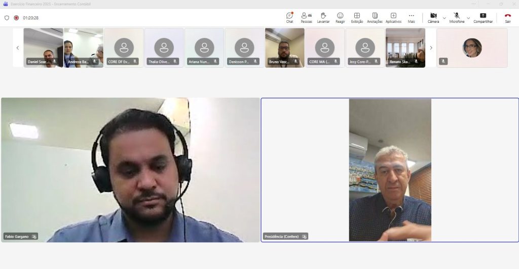 A Gerência de Auditoria do Confere realizou, na manhã desta quarta-feira, 21 de janeiro, reunião virtual com os contadores de todos os Conselhos integrantes do Sistema Confere/Cores. O encontro teve como foco o alinhamento dos procedimentos para o encerramento contábil do exercício financeiro de 2025, conforme as normas estabelecidas pela Resolução nº 2.169/2025 – Confere.